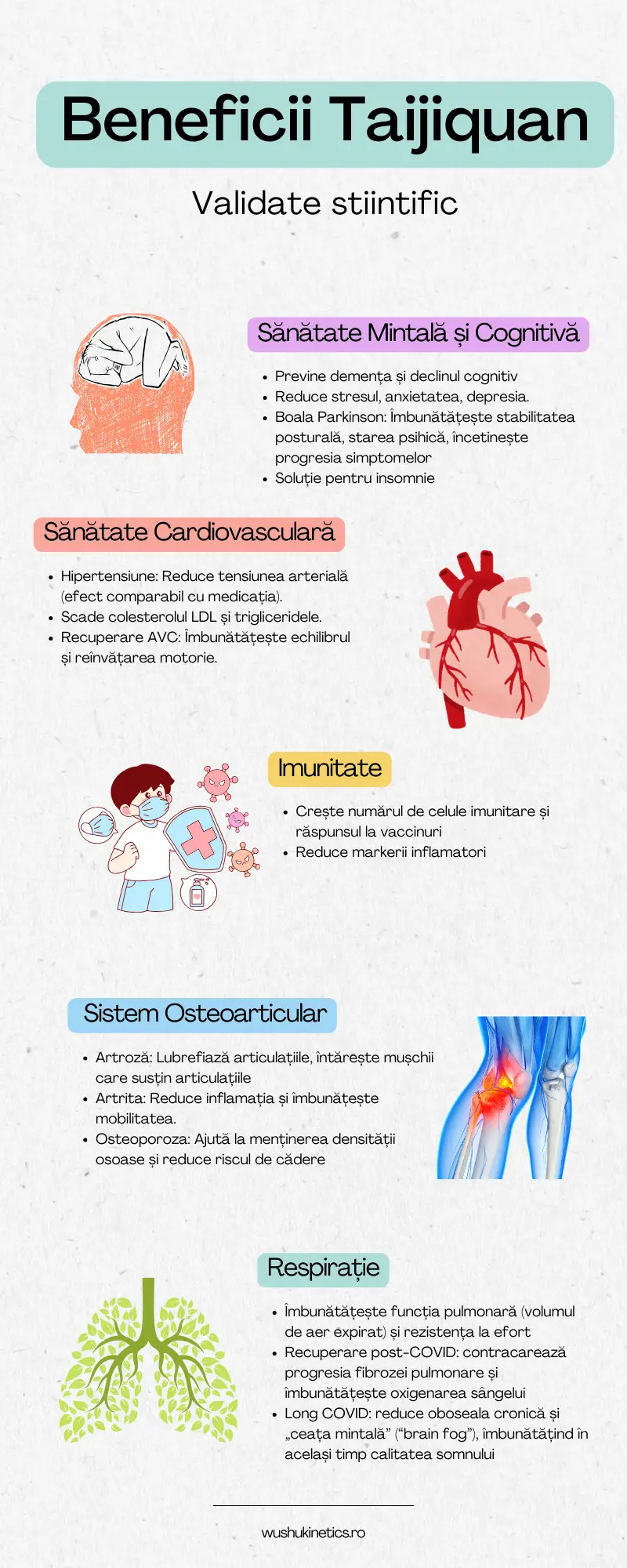 Reabilitare pulmonară: Practica regulată crește capacitatea pulmonară (volumul de aer expirat) și forța mușchilor respiratori. Mai mult, prin respirația profundă și controlată, Taiji poate ajuta la contracararea formării cicatricilor fibroase la nivelul plămânilor, îmbunătățind oxigenarea sângelui 14 15.